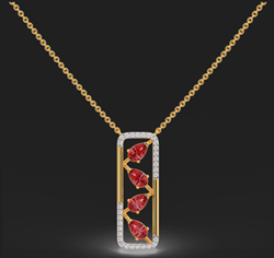 This stunning piece features three radiant red gemstones, symbolizing passion and resilience, set within a sleek diamond-studded frame.