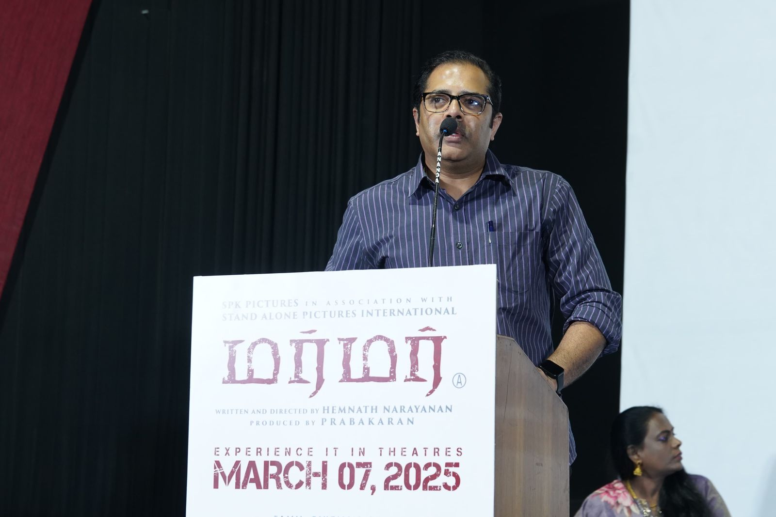 விழாவில் இயக்குநர் ஹேம்நாத் நாராயணன் பேசியதாவது, “பல இயக்குநர்களுடன் பணியாற்றி இருக்கிறேன். நிறைய பத்திரிகையாளர் சந்திப்புகளை கடந்து வந்திருக்கிறேன். அங்கிருந்து பார்த்து கைத்தட்டி இருக்கிறேன். அந்த வகையில், இங்கிருந்து பார்க்க மிகவும் சந்தோஷமாக இருக்கிறது. முதலில் அனைவருக்கும் வணக்கம். ஊடகம் இன்றி இங்கு எதுவும் இல்லை. அரசியல், நடிகர், இயக்குநர் என யாராக இருந்தாலும் அவர்களை அடையாளம் கண்டு முதலில் வெளிக்கொண்டு வரும். அந்த வகையில், முதலில் உங்கள் அனைவருக்கும் மிகப்பெரிய நன்றி. மர்மர் தமிழ் திரையுலகின் முதல் ஃபவுண்ட் ஃபூட்டேஜ் ஹாரர் திரைப்படம். இதை பற்றி கொஞ்சம் விளக்கிக் கூறுகிறேன். உதாரணத்திற்கு ஒரு குண்டுவெடிப்பு சம்பவம் அரங்கேறினால், அதுபற்றிய விசாரணைக்கு முதலில் அங்கிருக்கும் சி.சி.டி.வி. வீடியோக்களை தான் முதலில் ஆய்வு செய்வார்கள். அந்த சிசிடிவி வீடியோவில் இருக்கும் காட்சிகள் அவர்கள் தரப்பு ஆவணமாக இருக்கும். அதை படமாக காண்பிக்கும் போது, அந்த ஆவணத்தை தான் நாங்கள் படமாக காண்பிக்கிறோம். அமானுஷ்ய விஷயங்கள் சார்ந்த தகவல்களை பதிவிடும் ஏழு யூடியூபர்கள் ஜவ்வாது மலையில் இருக்கும் ஏழு கன்னிசாமிகள் மற்றும் மங்கை எனும் சூனியக்கார ஆவி சுற்றித்திரிவதை நேரடியாக பதிவு செய்ய செல்கிறார்கள். அவர்களுக்கு என்ன ஆனது, அவர்கள் செல்லும் வழியில் காணால் போகின்றனர். அவர்களை கண்டுபிடிக்க செல்லும் காவல் துறையினர் உடைந்து கிடக்கும் கேமராக்களை பறிமுதல் செய்கின்றனர். அவ்வாறு கேமராக்களில் உள்ள காட்சிகளை ஆவணப்படமாக வெளியிடுகிறார்கள். அதைத் தான் இந்தப் படத்தின் கதையாக வைத்திருக்கிறோம். இங்கு வந்திருக்கும் அனைவருக்கும் நன்றி. குகன் சார், பிரபாகரன் சார் நன்றி. நோயாளியாக வந்தீர்கள், தற்போது தயாரிப்பாளராக மாறியிருக்கிறீர்கள்.”