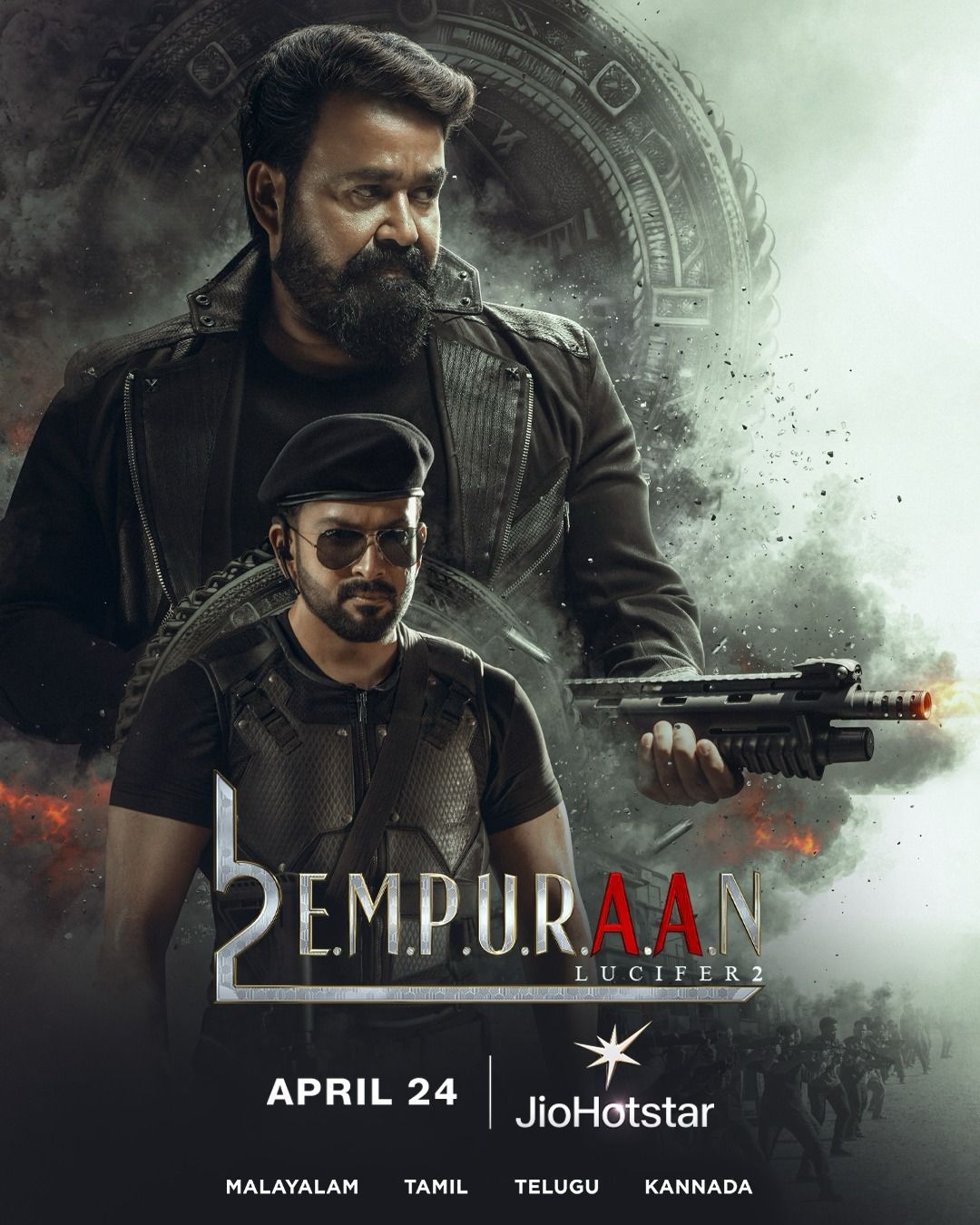 மலையாளம், தமிழ், தெலுங்கு மற்றும் கன்னடம் ஆகிய நான்கு மொழிகளில், எம்புரான் திரைப்படம் ஏப்ரல் 24 அன்று ஜியோஹாட்ஸ்டாரில் ஸ்ட்ரீமிங் செய்யப்படுகிறது. இந்த பிரமாண்டமான சினிமா அனுபவத்தைத் தவறவிடாதீர்கள்.