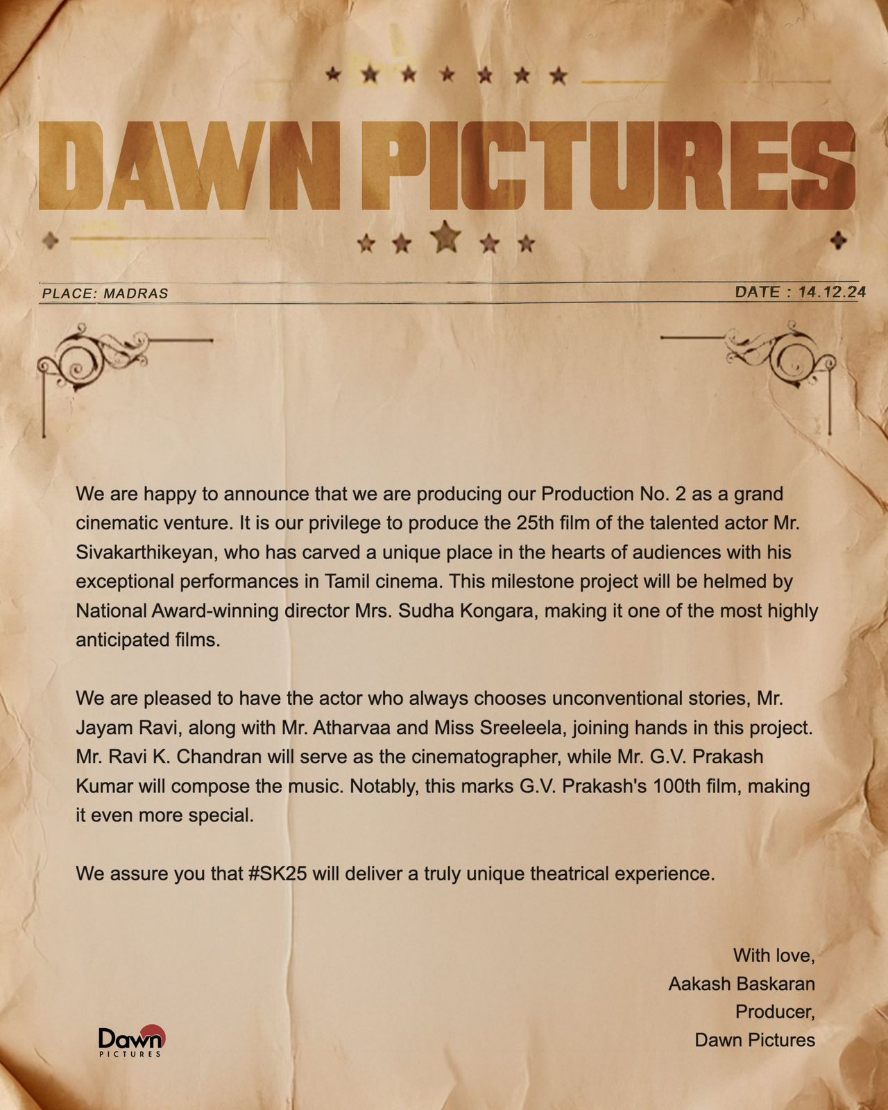 உங்களுக்கு புதிய திரை அனுபவத்தை கொடுக்கும் வகையில் #SK25 நிச்சயம் அமையும் என உறுதியளிக்கிறேன்” என்று தயாரிப்பாளர் ஆகாஷ் பாஸ்கரன் பதிவிட்டுள்ளார்.