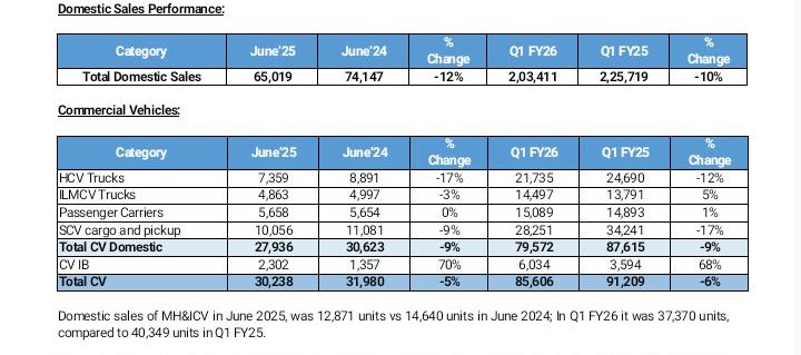 Domestic sales of MH&ICV in June 2025, was 12,871 units vs 14,640 units in June 2024; In Q1 FY26 it was 37,370 units, compared to 40,349 units in Q1 FY25.