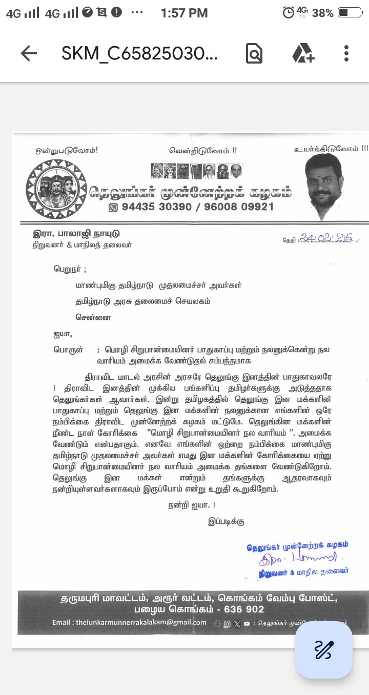 - Telugu Munnetra Kazhagam request to Tamilnadu CM
