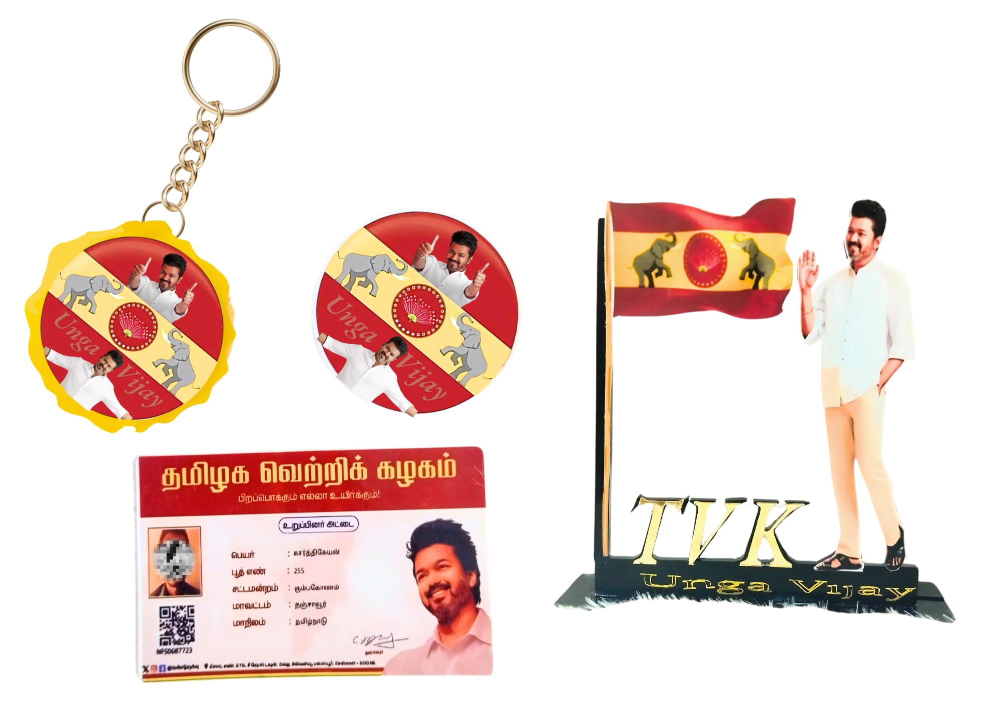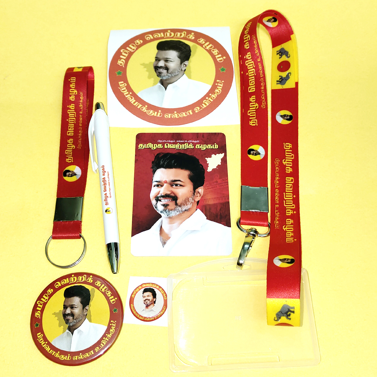 Vijay TVK Combo Kit – TVK Supporter Kit with Flag, Whistle Keychain, Ribbon Badge, Muffler, Vijay Sticker & Hand Band | Fan Merchandise Kit